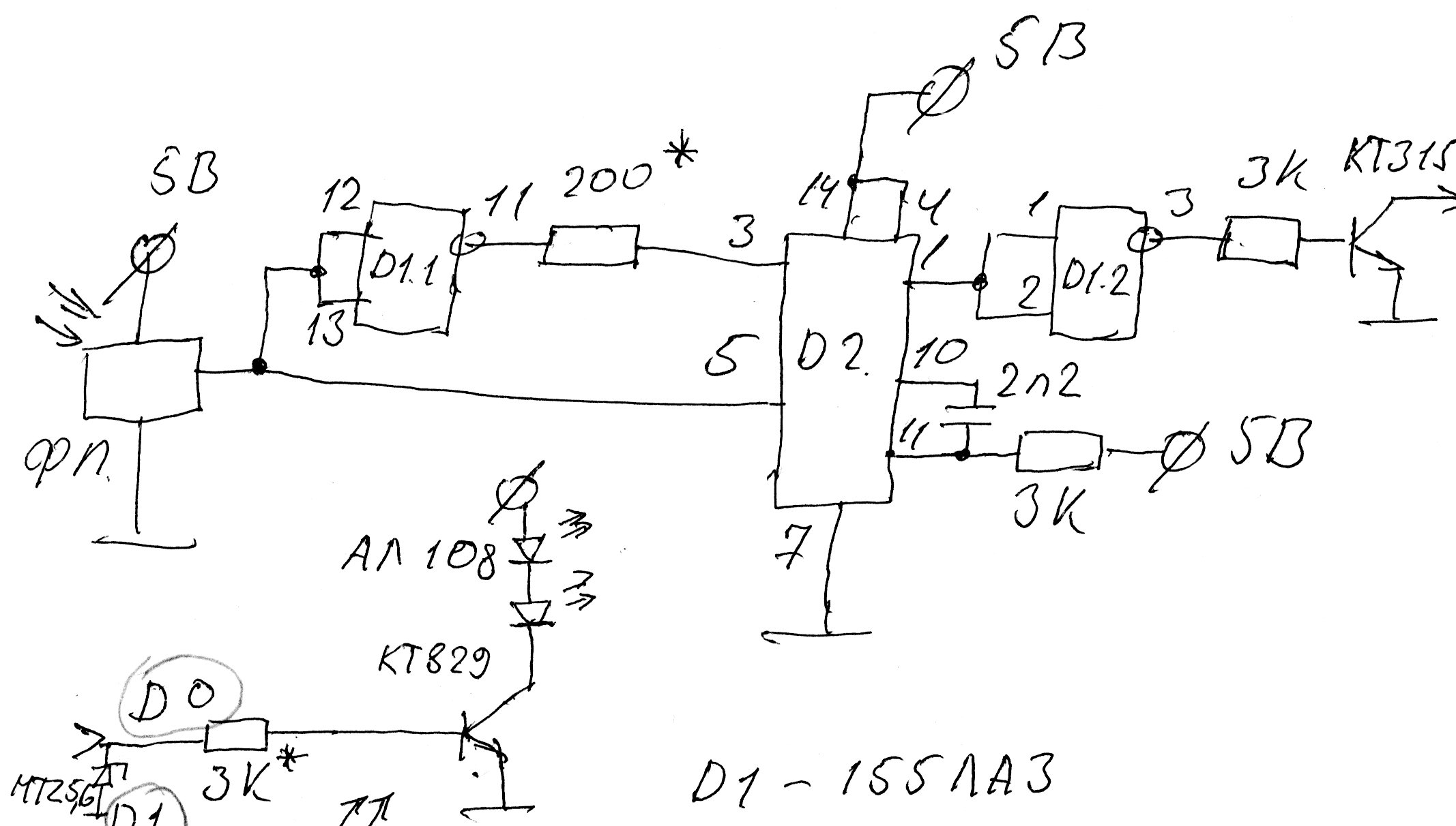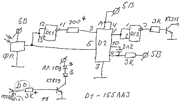 Начну с описания схемы. Состоит она из трёх блоков. Первый это питание, его схему недаю, соберёте сами. Схема может быть любая. Главное - на выходе должно быть 5 вольт. Второй это преобразователь сигналов пульта. Он состоит из фотоприёмника, (Взял трёхногий, монолитный, какая марка не знаю. Он может быть любой.) преобразователя фронтов в импульсы (Он собран на 155ла3 и 155аг1. Нужен он для преобразования каждого фронта входного сигнала в импульс. Так-как LPT порт понимает только отрицательные фронты. Схема тоже может быть любой.) и выходного усилителя (Сигнал с линии D0 порта через транзистор идёт на инфрокрасные светодиоды.). Тонкостей в сборке и насторйке нет никаких. Если собрали правильно - должно работать. Ёмкостью между 10 и 11 ногами D2 подбирается ширина выходного импульса. Смотрите по осцилографу - он должен быть гораздо уже чем единичный импульс с пульта и его должно хватать для надёжного сробатывания. На схеме (Кстати прошу прощения за её качетво) для особо пугливых я нарисовал два стабилитрона MTZ 5,6 на ногах порта ACK и D0 (Можно не ставить). Светодиод на линии D1 просто индикатор.