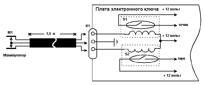 При использовании в походах электронных телеграфных ключей, выполненных на микросхемах серии КМОП, выяснилось, что их электронная начинка они очень чувствительны к сырости. Даже когда плата ключа была залита парафином (который, в случае необходимости ремонта, легко удаляется с помощью горячей воды и бензина) сбои в работе ключа происходили из-за попадания капелек воды на контакты манипулятора. Полностью устранить этот эффект мне помогла только герконовая развязка манипулятора от электронной семы ключа. На рис.1 показана схема этой развязки. Развязка была выполнена на малогабаритных герконах. Эти герконы были изъяты из сгоревшего герконового реле от телефонной станции. Герконы располагались на самой плате автоматического электронного ключа непосредственно около переключающей "точки" - "тире" микросхемы. Плата ключа с установленными на ней герконами была залита парафином. Манипулятор ключа был вынесен за пределы корпуса автоматического ключа.