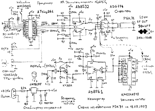 Плата рабочего макета, содержит всего три микросхемы: однокристальный микропроцессор фирмы ATMEL - ATtiny 26 L , операционный усилитель - AD 8532 и коммутатор аналоговых сигналов - ADG 774. Передаваемая информация подается непосредственно на ножки процессора от стандартной PC - клавиатуры в виде скан-кодов, или в виде ASCCI - кодов от компьютера через встроенный последовательный COM - порт, с использованием любой терминальной программы. Микропроцессор по программе преобразует полученную информацию в косинусоидальный, фазоманипулированный по правилам B PSK 31, сигнал с частотой 15,625 Герц. Операционный усилитель умощняет, полученный от процессора НЧ сигнал и подает его на первый вход ключевого балансного смесителя на микросхеме ADG 774. На второй вход смесителя подается сигнал несущей от кварцевого генератора процессора. С выхода смесителя DSB сигнал с полосой 31,25 Герц, который, по сути, и является сформированным на рабочей частоте сигналом B PSK 31, подводится непосредственно к антенному разъему. Выходная мощность на нагрузке 50 Ом пока только 100 милливатт, но, используя поразительные свойства данного вида модуляции, на диапазонах 80, 40 и 20 метров уже проведены первые успешные связи, например с RA3LW - (22.09.2002 40 M 5 mW ), UU4JO - (Крым, 7.10.2002 20 M 15 mW ), RV6AHJ - (Краснодарский край, 12.10.2002 20 M 15 mW ), EW1EA - (Белоруссия, 5.11.2002 80M 30mW), UA9CC – (6.12.2002 20M 50mW 595!). Прием велся привычным способом - с применением трансивера и компьютера. В дальнейшем в приемной части разработки предполагается использовать принцип прямого преобразования с захватом принятого НЧ сигнала петлей ФАПЧ, микропроцессорная обработка информации с выводом на ЖКИ дисплей в виде бегущей строки. Таким образом, без компьютера и передатчика, с минимальной энергетикой, на устройство из пяти, семи недорогих микросхем, скоро будут возможны связи без ограничения дальности! Будут вопросы, пожелания, предложения - пишите.Макаркин Сергей - sa_rx3akt (at) mtu-net.ru |