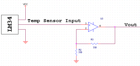 датчик LM34 и операционный усилитель LMC7111. Выходное напряжение в ОУ подается на один из