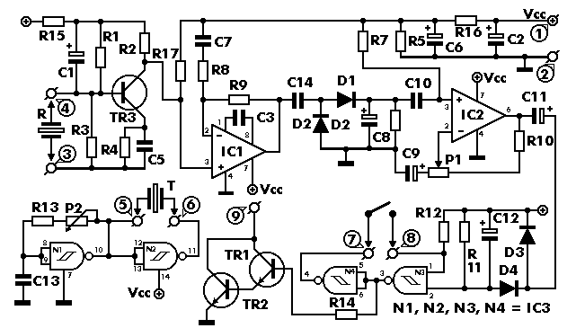Схема устройства Настройка Подсоедините между положительным полюсом источника питания и выводом 9 на схеме последовательно соединенные светодиод и резистор номиналом 560 Ом. Затем соедините положительный полюс источника питания с точками на схеме обозначенные как Vcc+. Движок переменного резистора P1 поверните в среднее положение. Затем медленно поворачивайте движок подстроечного резистора P2 и одновременно перемещайте кисть руки перед преобразователем до тех пор пока не будет загораться тестовый светодиод подключенный к точке 9. Быстрее произвести настройку можно, если использовать частотомер. Для этого подсоедините частотомер параллельно передающему УЗ преобразователю. Настраивая P2 добиваются совпадения частоты генератора и паспортного значения УЗ преобразователя. Затем P1 устанавливают требуемую чувствительность. Как вариант можно использовать НЧ осциллограф подключенный к коллектору TR3. В этом случае также настраивается частота генератора по максимальной амплитуде отраженного сигнала. Амплитуда отраженного сигнала на требуемой частоте будет максимальна если вся система УЗ преобразователей настроена в резонанс.