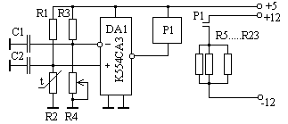Контроллер термостата Термостат устройства выполнен в виде сдвоенного герметичного металлического корпуса, снабженного автоматом подогрева. Пространство между внутренней и внешней оболочками корпуса заполнено минеральным веществом, обеспечивающим накопление и удержание тепла (имеет хорошую теплоемкость), равномерное распределение тепла по объему, пожаробезопасность и пр. Во внутреннем пространстве корпуса находятся электронные схемы критичные к понижению температуры окружающего воздуха. Контроллер термостата состоит из термодатчика и компаратора К554СА3. Нагревательный элемент выполнен из резисторов МЛТ-1, сгруппированных в нагревательные блоки и размещенных в между внешней и внутренней оболочками корпуса. Документация на микросхему К554СА3 Микросхемы изготовлены по биполярной технологии и представляют собой компаратор напряжения. Благодаря малым входным токам и большому коэффициенту усиления могут подключаться к высокоомным датчикам, использоваться в прецизионных преобразователях сигналов, генераторах импульсов. Предусмотрена возможность совместной работы с ЭСЛ-, ТТЛ- и МОП- схемами, для чего напряжение питания на коллектор выходного транзистора подается от внешнего источника в зависмости от типа логики. Корпус типа 201.14-1, масса не более 1 г.
