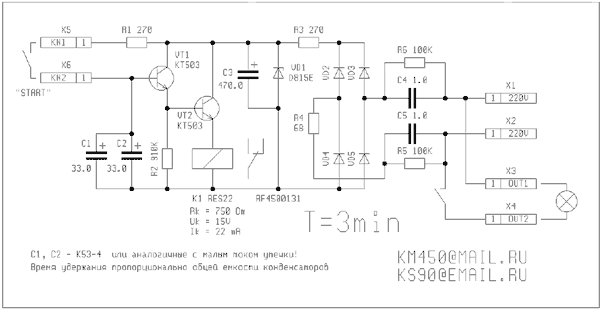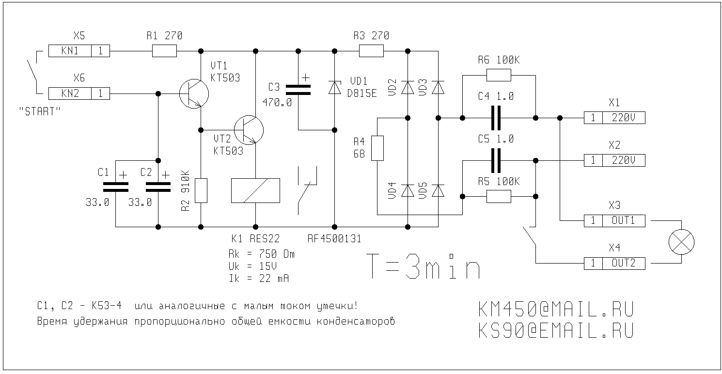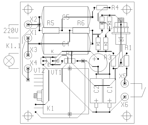 трансформатора, ни выключателя, ни корпуса). Рис.1. Принципиальная схема автомата включения освещения с задержкой выключения на три минуты (щелкните мышью для увеличения) На двери устанавливаем концевой выключатель и параллелим его с обычным. Когда дверь открывается через резистор R1 открываются транзисторы, заряжаются конденсаторы С1 и С2, срабатывает реле и нам светло. Закрываем дверь, конденсаторы С1 и С2 разряжаются и свет продолжает гореть примерно три минуты. Сам подбирал как было заказано. Применил К53-4 две штуки для уменьшения габаритов. Другие типы имеют большие токи утечки и как следствие малое время включения. Если бумажные ставить так это же какие размеры будут. Короче, какое нужно время срабатывания и какие размеры - такие конденсаторы и ставить. Питается схема от простейшего выпрямителя с гасящими конденсаторами C4 и C5 емкостью 1мкф на 250 вольт. Часто в телефонных розетках такие стоят. Параметры реле указаны на схеме. Напряжение стабилизации определяется напряжением срабатывания реле. При эксплуатации учесть - под напряжением сети! Хороший человек остался доволен, мне заплатил хотя и немного. Все собирался себе в общем коридоре сделать, но никто за это денег не дает а за бесплатно для всех так руки и не дошли. Рис.2. Рисунок печатной платы и расположение деталей, (печатка одностороняя) (щелкните мышью для увеличения) |
