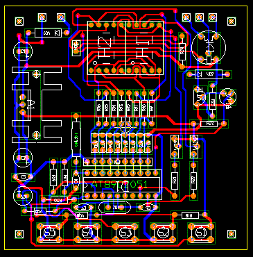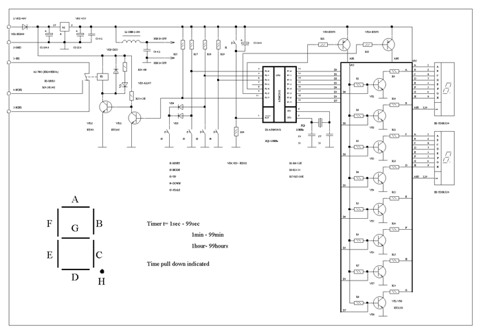 Таймер создавался для дозирования времени физиотерапевтических процедур. При этом ставилась задача обеспечить простоту и удобство управления и индикации при минимальной цене таймера. Схема таймера: Индикаторы с общим анодом. Их включение через ключи обеспечивает хорошую яркость цифр. Вначале нажатием S1 сбрасываем таймер, затем S2 выбираем режим: если секунды, то точки мигают часто, если минуты, то точки мигают редко, если часы, то совсем не светятся. Затем нажатиями S3 набираем на индикаторах нужное время, если перебор, то нажатиями на S4 уменьшаем время. Когда нужное время установлено, нажимаем S5 "Старт". При этом срабатывает реле. По окончании выдержки времени реле отпускает. Включение реле дублируется светодиодом. Если установлено время 2 и более минут, то последняя минута индицируется в секундах. Если установлено время 2 часа и более, то последний час индицируется в минутах, а последняя минута в секундах. Таким образом возможна установка времени в трех диапазонах: 1-99 секунд, 1-99 минут и 1-99 часов. При разработке таймера использованы материалы: www.qsl.net/dg5dbz/ Печатная плата таймера: