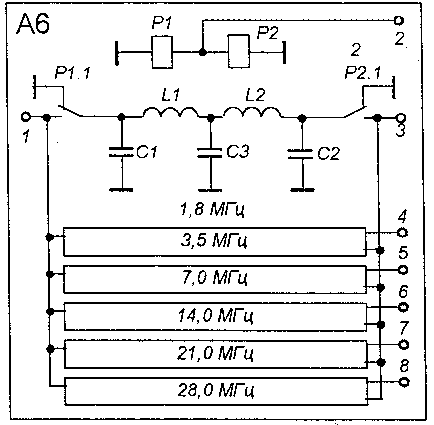 Рис. 7. Фильтры ФНЧ Конструкция и деталиКонструктивно передающая приставка сделана в виде отдельного блока. Компоновка плат зависит от индивидуальных возможностей каждого радиолюбителя. Одно условие - минимальная длина соединительных проводников. Печатные платы изготавливаются из двухстороннего фольгированного стеклотекстолита. Верхний слой сохраняется и выполняет функции "земли", а нижний служит для монтажных целей. Отверстия под элементы, не подлежащие заземлению необходимо раззенковать сверлом диаметром 3 мм. На рисунках печатных плат места заземления обозначены X . В блоке А1 регулятор "Уровень микр." выведен на лицевую панель. Между формирователем и 1-м смесителем устанавливается небольшой экран из белой жести. Блок А2 собирается на дюралюминиевой пластине, с одной стороны крепится КПЕ, с другой - плата фильтров. Диапазонная настройка облегчается верньером 1:10 на оси КПЕ и градуированной шкалой. Так как уровень ГПД при перестройке по диапазону меняется, то регулятор "Усиление" 680 Ом нужно вывести на лицевую панель. В драйвере А5 транзистор КТ904А устанавливается на радиатор из алюминия 55x30x5 мм. Между первым и второым каскадами устанавливается небольшой экран. Данные трансформаторов и контуров сведены в таблицы 1 и 2. При необходимости можно использовать и другие размеры ферритовых колец или контурных каркасов, однако, при этом придется подбирать количество витков и величины конденсаторов. Таблица 1
