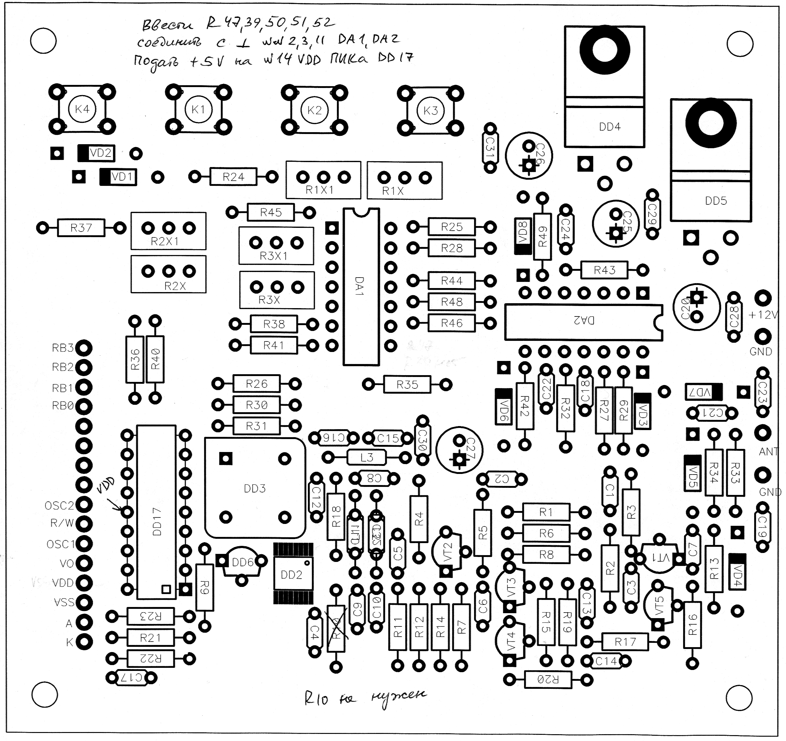 В зависимости от типа ЖКИ номиналы резисторов R21,R22 подбираются – с HY-1602В3 R21=12k, R22=1k. Т.е. подобрать по требуемой контрастности конкретного ЖКИ резистор R22. Диоды VD3-VD8 должны быть одинакового типа. Проверял и отлаживал это устройство с обычными подобранными по одинаковому прямому сопротивлению Д9. Катушки L1,L2 – берём сверло 4мм и мотаем на нём виток к витку 22 витков проводом примерно 0,4мм – как раз получается длина намотки такой катушки равняется расстоянию между отверстиями в плате для установки тех катушек. Катушки располагаем на расстоянии приблизительно 3-4мм от платы. В итоге частота среза такого фильтра 35МГц. Катушки заливаем парафином, чтобы они не помялись при дальнейших работах с прибором. Внимание! - Не заливать катушки никаким клеем! К чему это приводит – читайте мои опусы о трансивере Дунай… В качестве подстроечных резисторов R1X-R2X применил современные импортные многооборотные резисторы – см. фото платы. С такими резисторами достаточно и одного на 10-20кОм вместо двух последовательно бОльшего и мЕньшего номинала. Специально на плате разведены два последовательно, чтобы грубо подстраивать резистором бОльшего номинала, а уже точно резистором мЕньшего номинала. Посему (место на плате для этого есть) – можно поставить и обычные наши советские маленькие круглые или один многооборотный на 10-20кОм. Супервизор МС33064Р-5 можно не паять – всё работает и без него, он служит для защиты от «непредвиденных осложнений» в питающем напряжении на прибор. Подробно о супервизорах – в описании синтезаторов от UT2FW-RX6LDQ. Всё, господа… Ваяйте!!! Что непонятно – после 23:00 МСК 3,710+-QRM Как настраивать при помощи анализатора антенну?Это «тяжкий» вопрос, т.к. нужно учитывать несколько факторов и хотя бы примерно представлять физические процессы при этой работе. Подсоединяем анализатор к антенне и не понимаем каким образом наша антенна ещё работает… Вот такое у меня было ощущение, когда подсоединил анализатор к разъёму коаксиального кабеля четырёхугольной «рамки» периметром 80м, которую настраивал лет 10 назад при помощи обычного моста. Кстати, такое же ощущение у меня было и во время настройки той рамки, когда для проведения измерений подсоединял к ней ИЧХ Х1-38 – на экране АЧХ-ометра были видны сплошные «горбы и провалы», разобраться в которых как говорится «без бутылки» было невозможно. Посему, чтобы осознанно и правильно пользоваться этим прибором, потребуется ещё напрячься и освоить «теорию антенн и фидерных линий» для того, чтобы в итоге ваша антенна заработала должным образом. 1.Нахождение резонансной частоты антенны. 2.Измерение сопротивления антенны. При подсоединении антенны смотрим показания: R – это будет активная составляющая. Значение Х – это реактивная составляющая. Сопротивление можно измерить дистанционно через полуволновый повторитель. Но следует обязательно учитывать если R антенны сильно отличается от волнового сопротивления линии повторителя, то погрешность измерения будет большой. Но прибор тут не при чем – искажают показания потери в рассогласованной линии. Т.е. нет согласования между полотном антенны и питающей линией и анализатор покажет вам «итоговые комплексные» значения. 3.Измерение параметров кабеля. Предполагается, что начало и конец кабеля находятся рядом. Подсоединяем один конец кабеля к анализатору, а второй 