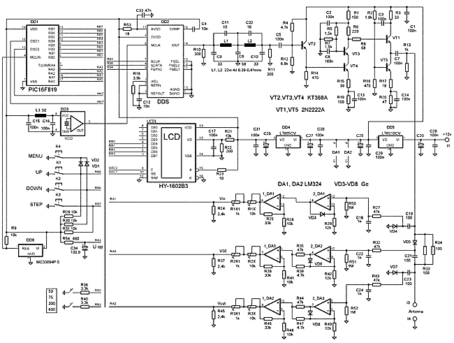 Прибор для настройки антенн. Информация для самостоятельных «паяльщиков». Исходные позиции.Несколько лет назад вызрела схемотехника и был испытан в железе синтезатор с применением современных цифровых синтезаторов, так называемых микросхем DDS. Конечно же появилась мысль применить такой синтезатор с приборе для настройки антенн в качестве ГССа. Даже удалось провести «лаб.работы» - собрать навесным монтажом такое изделие и проверить его работоспособность. Потом как обычно «текучка заела» и эта тема завалилась «за диван» на неопределённый срок. Несколько попыток довести до реально работающей конструкции всё время оканчивались безрезультатно… Видимо упорно нам мешали чужие мыслеформы по этой же теме… И вот, собравши все свои силы, в этом году мы с Владимиром RX6LDQ совершили героический подвиг – довели до рабочего образца этот прибор! Отправной точкой при разработке являлась минимально возможная стоимость прибора. Т.к. подобные изделия от известных «брэндов» по стоимости сопоставимы с хорошей антенной и как-то раскошеливаться на такую игрушку не хотелось. Тем более что потребна она крайне редко – обычно антенны свои мы сооружаем не чаще раза в год – или в несколько лет. Почти три сотни баксов (а то и больше) отстёгивать за такой буржуйский прибор, чтобы один-два раза попользоваться и потом забыть где сия коробка валяется – кому это захочется? Не берём в расчёт фанатов антенностроения, которые большую часть своей радиолюбительской жизни проводят на крыше – честь им и хвала! Но для «нормального» радиста этот прибор по частоте применения сопоставим разве что с частотой изготовления блоков питания для своих любимых кенвудов. Посему вбухивать в него деньги как-то не особо рационально. Хотя и достаточно выгодно, т.к. настроенная при помощи такого прибора даже «верёвочная» антенна явно выиграет в конечном результате при работе в эфире, нежели скажем применённый киловаттный УМ на неизвестного происхождения и конфигурации не настроенное изделие в виде антенны. Вообщем – ситуация ясная, прибор нужен, но бабки платить буржуям нету сенсу – посему – берём сами и делаем! В первый раз что ли? При проведении лабораторных работ было испытано несколько вариантов измерителей, благо что изобретать что-то по этой теме не нужно – описаний различных схем масса, начиная от «классики», заканчивая простейшими «замерятелями» на одном диоде. Схемотехника подобных приборов во многих чертах перекликается, т.к. принцип проведения измерений один и тот же. Различия в основном только в применяемой элементной базе и варианте отображения получаемых измерений. Как наиболее приемлемый вариант построения в этих ценовых рамках нам приглянулся «Антенный анализатор VK5JST» - это статья на сайте краснодарских радиолюбителей. Конечно пришлось переработать всю «цифру» и повозиться с «аналогом», прежде чем получилась вполне повторяемая и работоспособная конструкция. Больше пол года только ушло на изготовление различных вариантов печатной платы и шлифовку программного обеспечения. Да, забыл предупредить читателя – в случае возникновения «горящих» вопросов по теме - почаще заглядывайте по вечерам на частоты 3,700-3,720МГц – вот там меня и можно обнаружить почти каждый вечер в 23:00 МСК. Для любителей интернета – можно на форуме Что же это такое? В качестве гене