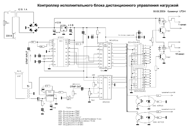 Система дистанционного управления предназначена для полнофункционального управления нагрузками, отображения их состояния на стороне управления с помощью ДТМФ тона и состоит из двух блоков: блока управления (он же и блок сигнализации), исполнительного блока, который непосредственно выполняет удаленное управление и одновременно выполняет функцию обратной связи. Линией связи является выделенная (некомутируемая) линия. Данное ниже описание приведено для ознакомления с возможностью конструкции и не является руководством для ее повторения. Описание блока управления – сигнализации:Схема блока управления изображена на рис. 1. Рис. 1. Схема блока управления (щелкните мышью для получения большого изображения) При начальной подаче питания на блок управления/сигнализации последовательно зажигаются все 19 светодиодов для теста, затем гаснут. Устройство готово к работе. Блок содержит клавиатуру и формирователь ДТМФ - сигнала. Управляющие команды – набор кодов см. приложение. Коды управления формируются нажатием соответствующих кнопок клавиатуры блока управления. ДТМФ кодер DD3 (это формирователь ДТМФ сигнала с клавиатуры) и преобразует нажатую клавишу в ДТМФ код, далее сигнал усиливается микросхемой DA6 LM386, нагруженной на трансформатор гальванической развязки, после чего сигнал поступает в линию связи. Требуемый уровень подстраивается потенциометром P2. Декодирование ДТМФ сигнала (ответные команды, приходящие с исполнительного блока), осуществляется микросхемой DD1. Выдача двоичного кода распознанной цифры с выводовQ1- Q4, а также с вывода Q5 - сигнал, свидетельствующий, что распознавание закончено. Далее посылка кода программно «распознается» и зажигается соответствующий включенной нагрузке светодиод, либо зажигается светодиод ошибки, если по прошествии 3 секунд не было завершена процедура управления (либо просто не распознана цифра в управляющей команде). Если в процессе управления происходит срабатывание двух охранных входов (т.е. если на них подано напряжение 12 Вольт) по прошествии 1 минуты происходит передача двух кодовых посылок, соответствующих состоянию каждого охранного входа, что отображается на блоке управления в виде соответствующего зажженного светодиода. Если никакого управления не происходит, один раз в минуту автоматически приходят 2 посылки, сообщающие о текущем состоянии охранных входов. Светодиоды подключены непосредственно к выходам порта контроллера. Сигнализацию ошибки и состояния "охранных" входов можно сбросить кнопкой "RESET". Отображение состояния нагрузки (16 светодиодов) реализовано с использованием двух последовательно включенных сдвиговых регистров DD4, DD5 в которые заносится информация о включенном светодиоде в последовательном коде. Описание исполнительного блока:Схема исполнительного блока изображена на Рис. 2. Рис. 2. Схема исполнительного блока (щелкните мышью для получения большого изображения) Здесь ДТМФ декодер DD1 подключен аналогично тому, как это сделано в блоке управления. Принцип работы тот же, контроллер запрограммирован на распознавание "своих", управляющих посылок, а именно распознает команды на включение или выключение нагрузки, выдает на ДТМФ кодер DD3 (кодер с параллельным вводом данных) и далее в линию связи, предварительно усиленные микросхемой DA6 (с регулировкой уровня) и че