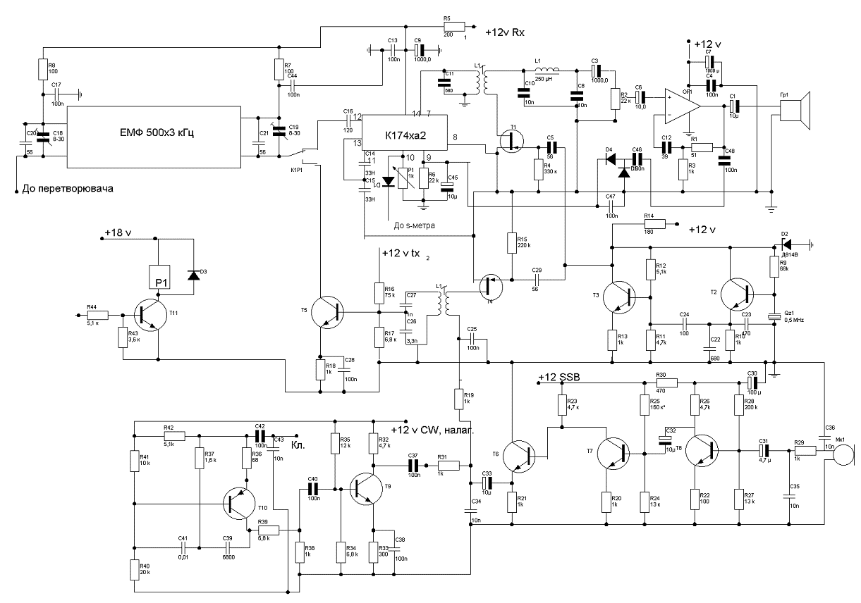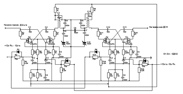 Несмотря на очевидные преимущества трансиверов с одним преобразованиям, старенький UW3DI все еще остается довольно популярным у радиолюбителей, ведь разрешает получить довольно неплохие параметры при относительной дешевизне. Конечно, лучше иметь более современный аппарат, лучший за шумовыми факторами, за динамическим диапазоном. Однако все это стоит довольно дорого да и тяжело достичь ожидаемых результатов в домашних условиях, если, иногда, единым прибором для отладки служит лишь тестер. Рис.1. Модернизация основной платы (Щелкните мышью для получения большого изображения) Именно это и обусловило появление настоящего трансивера, основная плата( рис.1) . Блок - схема его подобная к UW3DI, однако применяется другое расписание переменной промежуточной частоты: 4-4,5 МГЦ при ЕМФ с нижней боковой полосой и 5-5.5 МГЦ – с верхней. При этом частота ГПД остается одинаковой – 4,5-5 МГЦ. Рис.2. Смесители (Щелкните мышью для получения большого изображения) Смесители (рис.2) выполненные на полевых транзисторах с двумя затворами КП327 и особых объяснений не требуют, ведь подобные схемы использовались в радиоаппаратуре. Новым здесь есть лишь использование диодов в сети смещения, который позволяет получить при закрытии транзистора -12 в. на затворе. В основной плате использованны небалансные детектор и модулятор, так называемые переключающие схемы. При использовании КП303 подавлення несущей частоты составляет до 50 дб. Катушки на 500 кгц использованные от карманных приемников. При наличии микросхемы к122УН1В её можно использовать вместо микрофонного усилителя. Перевод с украинского. Контактная почта автора kobza (at) vc.ukrtel.net Используя эти платы можно модернизировать UW3DI, оставив в нем лище одну лампу ГУ-29 (ГУ –19). Другие каскады ( ПВЧ на КТ327, предшествующий усилитель мощности довольно описанные в литературе.) UR5NG ( EX UB5NCQ) . Изучается возможность заводского изготовления плат с рассылкой почтом. Потому просьба, сбросить на эл.почту заявку. |