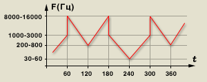 В последнее время наиболее популярными и агрессивно рекламируемыми физиотерапевтическими приборами для домашнего применения стал акустический прибор "Витафон" www.vitafon.ruи прибор лазерной магнитной светотерапии "Рикта"(он же "Милта", он же "Витязь") www.rikta.ru.Я поставил перед собой задачу создать домашний прибор, сочетающий в себе качества и того и другого. Для этого я изучил всю информацию, выложенную на их сайтах и всю доступную мне информацию по данным разделам физиотерапии. Чтобы понять принципы, заложенные в созданный мною прибор, Вам придется набраться терпения и прочесть довольно объемное лирическое отступление.Итак: ВитафонВсе тело человека пронизано кровеносными сосудами- от самых больших вен и артерий до средних и малых сосудов и мельчайших капиляров. Причем практически на всех участках тела имеются средние и мелкие сосуды и капиляры. Лишь вены и артерии есть не везде. Все сосуды человека имеют свойство перистальтики, то есть по сосудам постоянно прокатываются продольные волны малой амплитуды, проталкивая кровь. Если бы не было перистальтики сосудов, то требуемая для прокачки крови мощность сердца возросла бы в 8 раз! Частота этих волн зависит от диаметра и длины сосуда. При некоторых заболеваниях, особенно артритах, остеохондрозах, наблюдается ухудшение или нарушение перистальтики сосудов и, соответственно, ухудшение кровоснабжения участков тела, пораженных болезнью. Назначение прибора "Витафон"- путем акустического воздействия возбудить в сосудах продольные колебания, то есть возбудить перистальтику, улучшить кровоснабжение облучаемого участка и запустить или усилить процесс перистальтики, если он отсутствовал или был угнетен. И вот с этим- то, на мой взгляд, "Витафон" справляется не совсем хорошо! Рассмотрим зависимость частоты, генерируемой "Витафоном" от времени(взято с фирменного сайта):