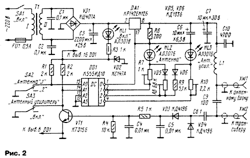 Схема блока питания показана на рис. 2, а алгоритм его работы приведен в таблице. На трансформаторе Т1, диодном мосте VD1 и конденсаторе СЗ собран выпрямитель с выходным напряжением 23...25 В. Микросхема DA1 — управляемый стабилизатор напряжения. Диоды VD3 и VD4 — детектор ВЧ напряжения. Блок подключают к трансиверу через разъем XW2, а кабель снижения — к XW1. Переключают режимы тумблерами SA2 и SA3. В режиме работы с антенной 1 и выключенном антенном усилителе (как показано на рис. 1 и рис. 2) на входах дешифратора низкий логический уровень, он же присутствует на выходе 0 DD1, на выходе микросхемы DA1 напряжение 1,2 В. Если перевести тумблер SA2 в положение "2", то на вход АО дешифратора DD1 поступит высокий уровень. Состояние дешифратора изменится, выходное напряжение блока увеличится до 7В и загорится светодиод HL2. Тумблером SA3 включают АУ. При переходе в режим передачи ВЧ сигнал трансивера выпрямляется диодами VD3, VD4 и поступает на транзистор VT1. Он открывается и устанавливает на входе А1 дешифратора низкий уровень. Это приведет к тому, что АУ будет отключен. Иными словами, блок питания позволяет осуществлять независимое переключение антенн и включение АУ.