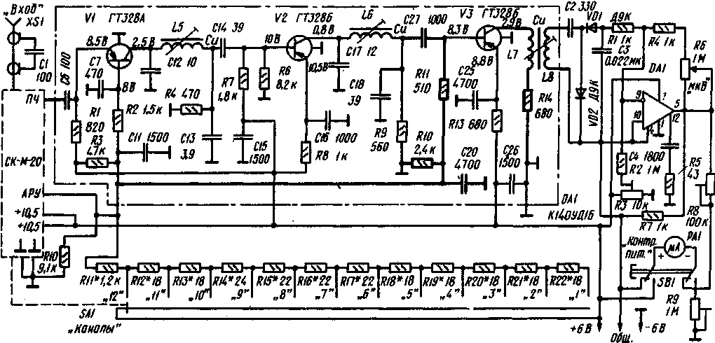 Прибор обеспечивает измерение напряжения радиочастоты (РЧ) в пределах от 60 мкВ до 1 мВ (со съемным делителем 1:10 - до 10 мВ). Относительная погрешность измерения - не более 30%. Размеры - 200X115Х100 мм, масса - не более 1,5 кг. Питается прибор от четырех батарей 3336Л, потребляемый ток - не более 40 мА. Структурная схема устройства изображена на рисунке. Измеряемое напряжение и,, поступает на вход селектора каналов, где усиливается и преобразуется в колебания ПЧ. С выхода усилителя ПЧ сигнал подается на выпрямитель, а выделенная им постоянная составляющая - на вход усилителя постоянного тока (УПТ), нагруженного индикатором выходного напряжения. Принцип измерения входного напряжения Uвх основан на определении угла поворота движка переменного резистора R6 в цепи отрицательной обратной связи (ООС), охватывающей УПТ. Значение угла прямо пропорционально уровню сигнала Uвх, если этим резистором устанавливать по прибору РА1 одно и то же выходное напряжение Uвых. ![]() [ Увеличить в новом окне ] Принципиальная схема прибора представлена на рис.1. Он собран на базе селектора каналов СК-М-20 [I]. Трехкаскадный усилитель ПЧ (обведен штрих-пунктирной линией) выполнен на печатной плате от такого же селектора (детали усилителя обозначены в соответствии с его принципиальной схемой, а новые элементы и соединения - утолщенной линией). Для получения одинакового усиления прибора на всех каналах служит делитель R10-R22 и переключатель SA1, закрепленный на оси селектора каналов и обеспечивающий подачу напряжения смещения в цепь автоматической регулировки усиления (АРУ) селектора и в цепи баз транзисторов первого и третьего каскадов усилителя ПЧ в зависимости от канала.