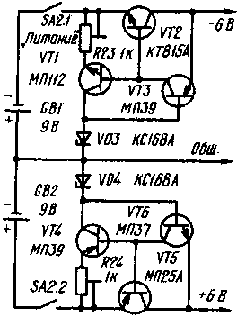 УПТ собран на ОУ DA1, охваченном ООС через резисторы R4, R6. Балансируют ОУ подстроечным резистором R3. К выходу УПТ через резистор R8 и кнопку SBI подключен микроамперметр РА1. На риску отсчета стрелку микроамперметра устанавливают при градуировке прибора подстроечным резистором R8. Резистором R9 добиваются отклонения стрелки микроамперметра на отметку 12 В в режиме контроля напряжения питания (кнопка SBI нажата). УПТ питается стабилизированным напряжением ±6 В от двуполярного источника (рис. 2), а селектор каналов и усилитель ПЧ - от него же, но напряжением 12 В (вывод -6 В соединен с их обшим проводом). За основу взято устройство, описанное в [2]. Стабильность напряжения питания сохраняется при снижении напряжения батарей GB1 и GB2 до 6,7 В. Ток. потребляемый самим стабилизатором, не превышает 1 мА. Прибор работоспособен и при уменьшении напряжения каждой из батарей до 5 В, но в этом случае ухудшается чувствительность и нарушается градуировка шкалы, поэтому прибор можно использовать только как индикатор при ориентировке антенн.
