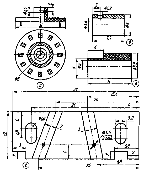 При сверлении отверстия диаметром 1,2 мм во втулку диска вставляют металлическую втулку (рис. 3, б). Затем с хвостовой части оси переключателя селектора каналов снимают стопорную пружину и латунную прокладку, надевают на ось диск переключателя и сверлят отверстие диаметром 1,2 мм под штифт. После закрепления диска штифтом стопорную пружину устанавливают на место.