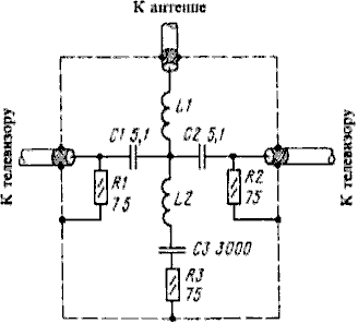 На рис. 1, а приведена принципиальная схема разветвительной коробки на два отвода от абонентского кабеля коллективной антенны, а на рис. 1, 6 - на три отвода. Коробка устанавливается в удобном месте квартиры, ее вход подключается к уже имеющемуся кабелю от разветвительной коробки коллективной антенны, а выходы соединяются телевизионными кабелями с телевизорами. К каждому выходу подключается один телевизор. Если по каким-то причинам к одному из выходов телевизор не будет подключен (например, его увезли на дачу или отправили в ремонт), к штекеру, предназначенному для подключения к антенному гнезду телевизора, нужно подключить резистор сопротивлением 75 Ом. В противном случае произойдет рассогласование, и изображения на экранах других телевизоров начнут двоиться. По этой же причине не следует делать в коробке лишние отводы, а если они имеются, к каждому из них нужно подключить резистор на 75 Ом. Как видно из схемы, коробка на два выхода содержит три резистора, коробка на три выхода - четыре резистора. Количество резисторов всегда будет на один больше числа выходов. Все резисторы в коробке, имеют одинаковое сопротивление, которое зависит от количества выходов и определяется по формуле: R = 75 x ( n - 1 ) / ( n + 1 ), где п — количество выходов разветвительной коробки. Точные значения сопротивлений резисторов, найденные по этой формуле, подбирать не следует, можно взять ближайший стандартный номинал: 24 Ома для двух выходов, 36 Ом для трех, 43 Ома для четырех и т. д. Конструкция разветвительной коробки достаточно проста. Корпус коробки выполняется из листовой меди, латуни или даже белой жести от консервной банки. Оплетки всех кабелей припаиваются к корпусу коробки, а центральные жилы - к резисторам. Резисторы могут быть типа ОМЛТ мощностью 0, 25 Вт. Коробка закрывается крышкой, выполненной из того же металла, которая в нескольких точках припаивается к корпусу коробки. После этого коробка крепится к стене. Недостатком такого способа разветвления сигнала является уменьшение напряжения сигнала на входе каждого телевизора во столько же раз, сколько аппаратов подключено к коробке, за счет потерь энергии сигнала в резисторах коробки. Обычно антенны коллективного пользования обеспечивают вполне достаточный уровень сигнала на абонентских отводах лестничной разветвительной коробки порядка 1 мВ. Поэтому при уменьшении такого напряжения сигнала в несколько раз разветвительной коробкой остается достаточный уровень для получения хорошего изображения на экране телевизора. Часто возникает вопрос: зачем нужны резисторы в коробке, приводящие к уменьшению уровня сигнала на ее выходах. Если бы, например, антенные гнезда трех телевизоров были непосредственно подключены к фидеру, он оказался бы сильно рассогласован с нагрузкой: ведь входное сопротивление каждого телевизора по антенному входу составляет 75 Ом, входное сопротивление трех параллельно соединенных - 25 Ом или втрое меньше сопротивления, необходимого для согласования фидера. В результате значительная часть энергии сигнала отразится обратно в фидер и не попадет на вход телевизоров. Более того, при неточном согласовании фидера с антенной, что обычно неизбежно, отраженный сигнал вновь отразится от антенны и поступит на входы телевизоров с задержкой, что приведет к двоению и многоконтурности изобра