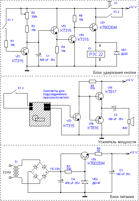За свою радиолюбительскую практику я собрал несколько схем звонков. Наиболее интересным оказался звонок на дешифраторе К155ИД10 с мелодией, програмируемой резисторами. По прошествии некоторого времени возникла идея: "А почему бы не разработать схему звонка самому?". Тем более дома накопилось изрядное количество старых музыкальных открыток, и было из чего выбрать мелодию. Проект не сложный. Звонок состоит из 3 основных модулей: блок питания, схема удержания кнопки, платка от открытки+усилитель мощности. В схеме использованы детали: транзисторы КТ315 (4 шт.), КТ816, КТ817, КТ602БМ (2шт.), диод Д220, стабилитрон Д814, диодная сборка, 4 электролитических конденсатора, 8 резисторов, реле РЭС22, сетевой трансформатор. В блоке питания можно использовать микросхемы-стабилизаторы на 12 В. Можно запитать от сетевого БП и схему открытки через гасящий резистор. Можно сделать на корпусе два разьема: один для подключения питания 220 В, другой для проводов от кнопки - так проще будет обслуживать звонок и менять батарейку в открытке. Подбором R2 и С1 можно регулировать длительность воспроизведения мелодии.