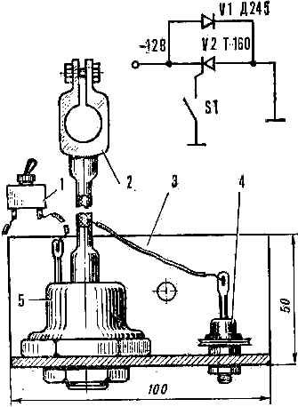 В конструкции электронного блока: 1 — микровыключатель, 2 — накидная клемма, 3— уголок 4 — диод, 5 — тринистор. Вариант конструкции электронного выключателя «массы» показан на рисунке. Оба полупроводниковых прибора установлены на дюралевом уголке размером 50Х50Х3 мм, длиной 100 мм. На одной полке в нем необходимо просверлить два отверстия — 0 21 мм для тринистора и 0 6,2 мм для диода средней мощности. На другой попке уголка просверлите отверстие под размер болта крепления к кузову автомобиля. Все электрические соединения выполните многожильным монтажным проводом, а к выводу катода тринистора подсоедините с помощью кабеля в металлической оплетке накидную клемму аккумулятора. Оплетку затем обмотайте изоляционной лентой, Готовое устройство поместите в металлический кожух и покрасьте его нитроэмалью под цвет автомобиля. Чтобы не сверлить в кузове автомобиля отверстие для управляющего провода, отыщите держатели, крепящие тормозную трубку к моторному отсеку, и аккуратно выбейте донышко. Вы получите 5-мм отверстие между моторным отсеком и салоном, через которое и пропустите управляющий провод. Отверните винты чехла, закрывающие рулевую колонку, просверлите в нем отверстие нужного диаметра и установите микровыключатель. К одному его выводу подсоедините управляющий провод, ко второму — провод, идущий; на «массу». Н. ВИДОНОВ |