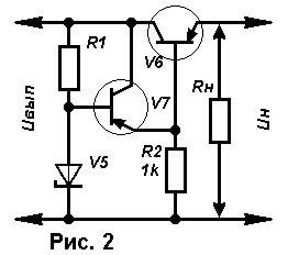 Может случиться, что маломощный стабилитрон не подойдет по максимальному току стабилизации и придется выбирать стабилитрон значительно большей мощности - такое случается при больших токах потребления и использовании транзистора с малым коэффициентом h21Э. В таком случае целесообразно ввести в стабилизатор дополнительный транзистор V7 малой мощности (рис. 2), который позволит снизить максимальный ток нагрузки для стабилитрона (а значит, и ток стабилизации) примерно в h21Э раз и применить, соответственно, маломощный стабилитрон. В приведенных здесь расчетах отсутствует поправка