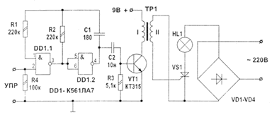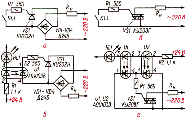 Многие устройства имеют в своем составе цепи управления (коммутации) нагрузкой, которые обеспечивают их включение/выключение и задают яркость свечения ламп и т.д.. Такие цепи обычно строятся на основе тиристоров или симисторов, реже применяют транзисторы, оптотиристоры или электромагнитные реле. Используя современные тиристоры и симисторы можно коммутировать мощные лампы с напряжением питания свыше 220 В. В маломощных светоизлучающих системах с этой же целью могут использоваться мощные транзисторы, которые управляют лампами с низким напряжением питания (возможные пределы зависят от параметров применяемых транзисторов). Ниже приводятся схемы нескольких простейших узлов коммутации нагрузки. Очень часто в качестве коммутирующих элементов используются тиристоры серии КУ202 и симисторы серии. КУ208. Эти компоненты выдерживают напряжения 25...480 В (зависит от конкретного типа элемента) и обеспечивают ток в открытом состоянии до 5...10 А. Если же необходимо коммутировать светоизлучатели большей мощности, то могут применяться тиристоры серий Т106-10-4, Т122-20-2, Т131-40-3. В общем случае применение симисторов в качестве коммутирующих элементов несколько упрощает схемы вследствие того, что они могут коммутировать переменное напряжение, т.е. отсутствует необходимость во включении диодного моста на входе силовой цепи (повышается КПД и уменьшаются габариты устройства в целом). Кроме этого, имеется принципиальная возможность применения оптотиристоров, которые обеспечивают гальваническую развязку между силовыми цепями и схемой управления. ![]() Puc.1 На рис.1 приведена типовая схема включения тиристора в качестве элемента коммутации обычных ламп накаливания. Управляющий сигнал с амплитудой 3...7В подается непосредственно на управляющий электрод тиристора VS1. Схема управления должна обеспечивать ток до 200 мА на этом входе. Диодный мост VD1-VD4 обеспечивает подачу на тиристор постоянного напряжения (в случае применения симистора диодный мост можно удалить). ![]() Puc.2 На рис. 2 схема коммутации дополнена эмитгерным повторителем. Слаботочный управляющий сигнал подается на базу транзистора VT1. Ток коммутации протекает через транзистор, то-коограничивающий резистор R1 и управляющий электрод тиристора VS1. В этом случае входное управляющее напряжение может иметь амплитуду немногим более 1 В. ![]() Puc.3 С помощью оптронного тиристора (рис. 3) можно гальванически развязать управляющий сигнал и силовые цепи. В этом случае управляющие импульсы поступают на тиристор уже с оптрона. ![]() Puc.4 Схема на рис. 4 позволяет реализовать гальваническую развязку с помощью импульсного трансформатора. На элементах D1.1 и D1.2 собран высокочастотный генератор с частотой 25 кГц. В исходном состоянии генератор заперт низким уровнем на входе 2 элемента D 1.1. При появлении на входе 2 высокого уровня генератор, запускается и высокочастотные импульсы открывают тиристор VS1 (лампа зажигается). На рисунке 5 приведены другие часто встречающиеся схемы. ![]() Puc.5 Источник: shems.h1.ru |