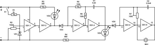Для миниатюрной электронной аппаратуры и приборов, питающихся от аккумуляторных батарей или гальванических элементов, весьма полезным устройством является индикатор разрядки источника питания. Такой индикатор позволяет, обнаружив разрядку, своевременно предпринять меры для перезаряда аккумуляторов или замены гальванических элементов. На рис.1 для примера приведены характерные кривые разряда никель-кадмиевых аккумуляторов токами от I=0,2С до I=3С, где С — емкость аккумулятора в амперчасах , из которой видно, что при разрядке на 80...90% напряжение на них падает приблизительно на 0,15 В от номинальной величины 1,25 В. Сходно ведут себя и никель-металло-гидридные аккумуляторы. Что касается обычных марганцево-цинковых или алкалиновых гальванических элементов, то их падение напряжения при той же степени разрядки составляет приблизительно 0,2...0,25 В от номинальных 1,5 В. Исключение составляют лишь литиевые элементы, которые практически до полного разряда сохраняют номинальное напряжение. ![]() Рис. 1. Кривые разряда Ni-Cd аккумулятора Таким образом, для индикации разрядки подавляющего большинства гальванических источников питания достаточно регистрировать уменьшение их напряжения на величину примерно от 150 мВ у одного аккумулятора до 2...2,5 В у батареи из 8...10 гальванических элементов. Обычно такие индикаторы реализуются на основе микросхем, уже включающих в себя компаратор напряжения. В других случаях для этого, как правило, используются операционные усилители, на которых также собирается компаратор. Здесь предлагается индикатор, построенный на цифровой микросхеме. Его компаратор выполнен на КМОП — инверторе, в качестве которого применен базовый элемент микросхемы К561ЛН2. Опорное напряжение Uо подается на вход инвертора, а сравниваемое положительное напряжение источника питания Uи.п. на ножку 14 питания микросхемы. Из характерных кривых на рис.2 видно что в достаточно широкой области вокруг произвольно выбранного номинального значения Uи.п. напряжение переключения инвертора Uп связано с напряжением его питания соотношением Uп = xUи.п., где x = const и x >> 0,4 при переключении инвертора из состояния логической «1» в «0» и x >> 0,6 в обратном случае. Следовательно, с уменьшением напряжения питания при прохождении точки Uи.п. >> 2,5Uо инвертор, выход которого предварительно находился в состоянии «1», будет изменять его на противоположное. Крутизна переходной характеристики инверторов 561 серии при работе на высокоомную нагрузку вполне достаточна для фиксации перепада контролируемого напряжения порядка десятка милливольт. ![]() Рис. 2. Принципиальная схема индикатора разрядки для источников питания с номинальным напряжением в пределах 3...6 В приведена на рис.3. Компаратор выполнен на инверторе DD1.1. Опорное напряжение формируется цепочкой R1, R2, VD1, где VD1 — источник опорного напряжения КА.336-2.5. Часть напряжения, падающего на VD1, а для КА.336-2.5 это 2,48 В, подается на вход DD1.1 через резистор R2, которым устанавливается порог срабатывания компаратора. Нормальное и разряженное состояния источника питания индицируются светодиодами VD2 и VD4 соответственно. Инвертор DD1.2 выполняет функцию буфера, препятствующего уменьшению крутизны переключательной характеристики инвертора при включении светодиода VD2. ![]() Рис. 3. Помимо светового сигнала, разряженное состояние источника и