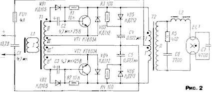 Принципиальная электрическая схема преобразователя показана на рис. 2. Колебательный контур образован элементами L2, С7. Инвертор выполнен по схеме двухтактного автогенератора с положительной обратной связью по току (ПОСТ) на элементах Т1, Т2, L1, VT1, VT2, VD1—VD6, С2—С5, R1— R4. Такое построение инвертора позволяет минимизировать энергию, затрачиваемую на управление ключевыми транзисторами VT1, VT2, и снизить влияние напряжения источника питания на стабильность работы преобразователя. В этом случае легко обеспечиваются и оптимальные частоты преобразования. Кроме указанных выше элементов, преобразователь содержит плавкий предохранитель FU1, конденсатор С1, защищающий источник питания от импульсных токов, и цепочку С6R5, подавляющую высокочастотные колебания напряжения на обмотках трансформатора Т2. Работает преобразователь следующим образом. В момент подачи питающего напряжения транзисторы VT1, VT2 закрыты и напряжение на их коллекторах равно напряжению питания. Через резисторы R1, R2 протекает ток, заряжающий конденсаторы С2, С3 в направлении, противоположном их полярности, указанной на схеме. Через некоторое время напряжение на базе одного из транзисторов (например, VT1) достигнет порога его открывания и через коллекторную цепь потечет ток, который пройдет также через источник питания, обмотку I трансформатора Т2 и обмотку III трансформатора Т1. В результате появится ток и в обмотке II трансформатора Т1, который, в свою очередь, потечет через конденсатор С2 и переход база — эмиттер транзистора VT1. При этом VT1 входит в режим насыщения, а конденсатор С2 перезаряжается в соответствии с указанной на схеме полярностью. Его перезарядка ограничивается диодом VD1. Таким образом происходит запуск преобразователя. Транзистор VT1 будет находиться в состоянии насыщения до тех пор, пока не прекратится базовый ток, что может произойти в результате снижения тока через первичную обмотку трансформатора Т2 или при коротком замыкании обмоток трансформатора Т1. Запускается преобразователь на резонансной частоте контура L2С7, и транзисторы VT1, VT2 будут переключаться в момент перехода через нуль тока дросселя L2. После зажигания лампы ЕL1 и шунтирования ею конденсатора С7 передача энергии дросселя L2 лампе и конденсатору С7 затягивается и частота преобразования снижается. Ее стабилизация при этом происходит на уровне, определяемом временем перемагничивания дросселя L1, который, насыщаясь, замыкает накоротко обмотку трансформатора Т1, что приводит к закрыванию одного транзистора и открыванию другого. Частота настройки колебательного контура выбрана равной 46 кГц, а рабочая частота преобразователя — 20...25 кГц. При таком отношении частот обеспечивается максимальная эффективность работы. Цепочки С4VD5RЗ и С5VD6R4 служат для снижения амплитуды коммутационного импульса на коллекторах транзисторов VT1, VT2 при их закрывании. Преобразователь смонтирован на печатной плате из фольгированного стеклотекстолита размерами 200x50 мм. Он может быть встроен в светильник или помещен в отдельный кожух. При монтаже дроссель L1 и трансформатор Т1 желательно разместить возможно дальше от трансформатора Т2 и дросселя L2, а оксидные конденсаторы С2, СЗ не располагать в непосредственной близости от транзисторовVT1, VT2 и резистора R5. В преобразователе применены резисторы МЛТ конденсаторы К73-17 (С1, С4, С5)