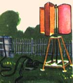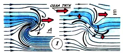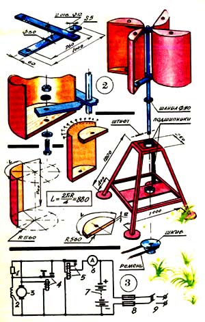 Устройство представляет собой две половинки полого цилиндра, которые после его разрезки раздвигались в стороны от общей оси (см. рис. 1А). Образовавшееся тело обладало ярко выраженной аэродинамической несимметричностью. Набегающий поперек его оси поток воздуха как бы соскальзывал с выпуклой стороны одного полуцилиндра. Зато другой, обращенный к ветру своеобразным карманом, оказывал значительное сопротивление. Барабан поворачивался, полуцилиндры менялись местами все быстрее и быстрее, и вертушка таким образом быстро раскручивалась. Вот этот принцип, возможно и не зная о нем, и взял за основу своей будущей ветроэлектростанции Сережа Курнев. Подобная схема выгодно отличается от ветроустановки с пропеллерной вертушкой. Во-первых, она не требует при изготовлении большой точности и дает широкий выбор применяемых материалов. Во-вторых, она компактна. ![]()