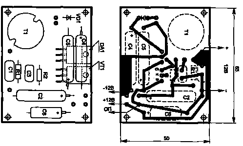 При настройке может потребоваться подбор конденсатора СЗ и резистора R2. Трансформатор Т1 выполняется на броневом сердечнике типоразмера Б22 из феррита 2000НМ (1500НМ) и содержит в обмотке 1 — 80 витков, 2 — 15 витков, 3—110 витков провода ПЭЛШО-0,18. После проверки и настройки схемы катушку и ферритовые чашки закрепить клеем. Конденсаторы С2, С4, С5 применены типа К50-29-63В, С1 и СЗ — любые малогабаритные, С6 — К53-1А-20В. Все элементы схемы размещены на печатной плате с размерами 65х50 мм. Для уменьшения высоты платы монтаж выполнен в двух уровнях — конденсаторы С4 и С5 расположены над элементами VT1 и DA1. Схема позволяет получать и более высокое выходное напряжение, чем на входе, если использовать отрицательный выброс напряжения.