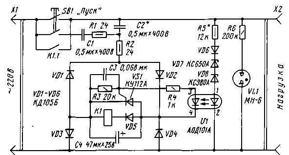 Основой предлагаемого полуавтомата служит мощное электромагнитное реле К1. Для питания его обмотки постоянным током применен выпрямительный MOCTVD1-VD4, подключенный к сети через гасящие конденсаторы С1 и С2. Включают устройство кратковременным нажатием на кнопку SB1. При этом реле К1 срабатывает и его замыкающиеся контакты К 1.1 блокируют контакты пусковой кнопки. Конденсатор С1 обеспечивает необходимый пусковой ток реле при включении. В рабочем режиме реле удерживается током, текущим через конденсатор С2, до напряжения сети не ниже 160 В. При налаживании устройства емкость конденсатора С2 (а иногда и конденсатора С1) приходится подбирать для каждого типа реле индивидуально. При повышении напряжения сети до 240 В открываются стабилитроны VD7 и VD8. Одновременно срабатывает оп-трон U1 и открывается тринистор VS1 .блокирует цепь питания обмотки реле К1. В результате реле отпускает и его размыкающиеся контакты К1.1 отключают нагрузку устройства от питающей сети переменного тока. Конденсатор СЗ, шунтирующий резистор R3 в цепи управления тринистором VS1, предотвращает срабатывание защиты от импульсных помех. Резисторы R1, R2 ограничивают броски тока через контакты пусковой кнопки SB1, одновременно являясь "предохранителями" в случае пробоя конденсатора С1 или С2. Диод VD5 улучшает быстродействие устройства, которое определяется в основном типом примененного реле и составляет доли секунды. Время отпускания реле РЭНЗЗ, использованного в описываемом устройстве, не превышает 4 мс, чего вполне достаточно для надежного срабатывания защиты. Резистор R5 ограничивает ток, текущий через светодиод оптрона U1. Подбором его (в пределах 8...25 кОм) можно регулировать в небольших значениях (5... 10 В) порог срабатывания защиты по превышению входного напряжения. Конструктивно полуавтомат выполнен в виде переносного удлинителя. На его лицевой стенке-крышке установлены сетевая розетка Х2, кнопочный выключатель SB1 (КМ2-1 или П2Кбез фиксации) и индикатор VL1. Электромагнитное реле (РЭНЗЗ), тринистор VS1 и все другие детали смонтированы на печатной плате из одностороннего фольги-рованного материала, которая размещена в пластмассовом корпусе. Реле К1 может быть любого типа, на рабочее напряжение 12...60 В, а его контакты рассчитаны на ток не менее 2...3 А при напряжении сети 220 В. При этом соответственно должно быть и номинальное напряжение конденсатора С4. Конденсаторы С1 и С2 - К73, МБМ, МБГО на номинальное напряжение не менее 350 В (С2 лучше на 400 В). Стабилитроны VD7 и VD8 заменимы на аналогичные, суммарное напряжение стабилизации которых может быть от 310 до 340 В при токе 10... 12 мА. При меньшем суммарном напряжении стабилизации этих приборов (250...300 В) резистор R5 должен быть сопротивлением 30...47 кОм и большей рассеиваемой мощности. В этом случае появится возможность увеличения нестабильности порога срабатывания защиты. Диодный оптрон АОД101А (U1) допустимо заменить транзисторным серии АОТ110 или АОТ127, соединив резистор R4 с эмиттером фототранзистора, анод тринистора VS1 - с выводом его коллектора, а между базой и эмиттером установить резистор сопротивлением 1 МОм. При этом и тринистор может быть с большим током управления, например, серии КУ201 или КУ202. Налаживание устройства сводится в основном к подбору конденсаторов С2 и С1. Подбирая первый из них, добиваются отключения устройства при снижении напряжени