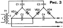 Принцип его работы понятен из рис. 1, на котором приведена схема однополупериодного умножителя. Рассмотрим происходящие в нем процессы поэтапно. Во время действия отрицательного полупериода напряжения конденсатор С1 заряжается через открытый диод VD1 до амплитудного значения приложенного напряжения Uа. Когда к входу умножителя приложено напряжение положительного полупериода, конденсатор С2 через открытый диод VD2 заряжается до напряжения 2Uа. Во время следующего этапа - отрицательного полупериода - через диод VD3 до напряжения 2Uа заряжается конденсатор С3. И, наконец, при очередном положительном полупериоде до напряжения 2Uа заряжается конденсатор С4. Очевидно, что запуск умножителя происходит за несколько периодов переменного напряжения. Постоянное выходное напряжение складывается из напряжений на последовательно включенных и постоянно подзаряжаемых конденсаторах С2 и С4 и составляет 4Uа.