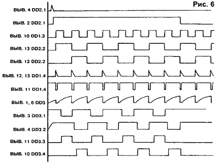 Другой вариант схемы управления представлен на рис.5. Задающий генератор выполнен на DD1.1...DD1.3, его частота устанавливается с помощью R3. Далее частота делится на два триггером DD2.2. При этом получается нужная частота (50 Гц) и одинаковая длительность импульсов. Импульсы с генератора также проходят через цепочку C5-R7 на вход DD1.4, который их инвертирует. Получаются короткие отрицательные импульсы, которыми С8 периодически разряжается через VD3. В остальное время С8 заряжается через R11. Чем больше R11, тем дольше заряжается С8, и длиннее длительность паузы между выходными импульсами. Цепочка R11-C8 управляет двумя выходами через элементы DD3.1 и DD3.2. DD3.3 и DD3.4 - инверторы выходных импульсов.