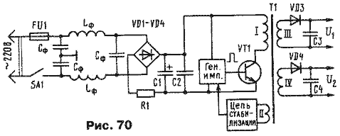 В бытовой аппаратуре, в частности в современных телевизорах и компьютерах, используют импульсные блоки питания (рис. 70), принцип действия которых состоит в следующем. Сетевое напряжение 220 В выпрямляется диодным мостом VD1- VD4. Получившееся постоянное напряжение примерно 300 В подается на генератор, вырабатывающий последовательность импульсов, питающих малогабаритный импульсный трансформатор Т1 на магнитопроводе из феррита. Он и обеспечивает гальваническую развязку питаемой аппаратуры от сети. Чтобы уменьшить проникновение импульсных помех в питающую сеть, обязательно устанавливают фильтр, содержащий дроссели Lф и конденсаторы Сф. Резистор R1 нужен для ограничения тока через диоды выпрямителя в момент включения, когда оксидный конденсатор С1 (емкостью до 100 мкФ и более) еще не заряжен. Керамический конденсатор С2 значительно меньшей емкости уменьшает высокочастотные пульсации выпрямленного напряжения при работе генератора. Мощный высоковольтный транзистор VT1 работает в ключевом режиме с высоким КПД. Он открывается импульсами генератора и создает ток в первичной обмотке трансформатора. Импульсное напряжение со вторичных обмоток (III и IV) выпрямляется и сглаживается. Еще одна обмотка (II) питает цепь стабилизации, которая управляет длительностью и/или частотой импульсов так, чтобы напряжения U1 и U2 были стабилизированы. Более подробное описание импульсных блоков питания можно найти в журнальных статьях и специальной литературе. В мощных импульсных блоках питания используют и двухтактные генераторы и выпрямители. Генераторы импульсов и цепи стабилизации (обозначенные прямоугольниками на рис. 70) теперь часто выполняют в виде готовых интегральных схем.