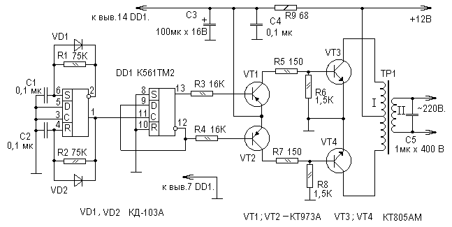 Устройство,описанное ниже, преобразует постоянное автомобильное постоянное напряжение 12В в переменное 220В, с частотой 50 Гц. Выходная мощность около 30 Вт. Оно под нагрузкой потребляет ток около 2,5 А. Преобразователь содержит задающий генератор на частоту 100Гц на триггере DD1.1, делитель частоты на 2 на триггере DD1.2, предварительный усилитель на транзисторах VT1, VT2 и усилитель мощности на транзисторах VT3,VT4, нагруженный трансформатором Т1. Задающий генератор обладает высокой стабильностью частоты (не хуже 5% при изменении питающего напряжения от 6 до 15 В). Делитель частоты одновременно играет роль симметрирующей ступени, позволяя улучшить форму выходного напряжения преобразователя. Вторичная обмотка трансформатора Т1 с конденсатором С5 и нагрузкой образуют колебательный контур с резононсной частотой около 50 Гц.