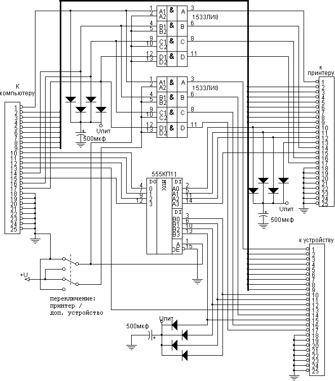 При помощи этой схемы можно подключить к одному порту для принтера 2 устройства. Это может быть полезно, например, при соединени 2-х компьютеров через LPT порт для принтера, когда в этот порт ещЈ должен подключаться принтер.