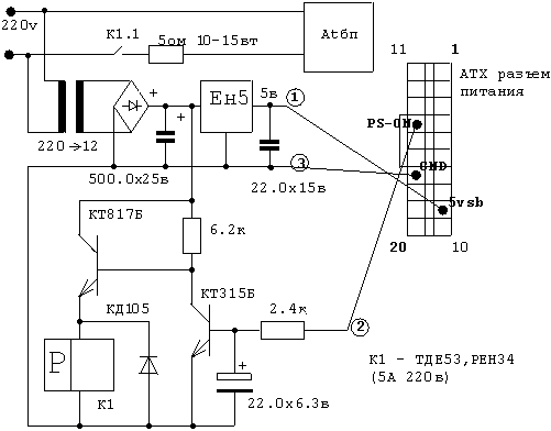 У многих имеются старые блоки питания конструктива АТ. Предлагаемая несложная доработка блока питания вашего компьютера позволит вам получить блок конструктива АТХ. Аналогичные схемы переделки уже публиковались и это одна из таких схем. После переделки блок АТ будет содержать главную функцию - возможность отключения по окончании работы вашего компьютера и включении его, как в блоке конструктива АТХ. Вся переделка блока питания конструктива АТ хорошо видна на рисунке. Все дополнительные элементы устанавливаются в блоке питания вашего компьютера, а дополнительные соединительные провода припаиваются и выводятся из блока питания на АТХ разъем питания на материнской плате вашего компьютера.