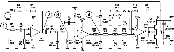 Для получения сигнала обратной связи в цепь питания двигателя включен датчик тока R1 (рис. 1). Ток, потребляемый двигателем, создает на этом резисторе падение, которое имеет переменную составляющую около 100 мВ peak-to-peak (рис.2, график 1). Основная гармоника выделяется с помощью простейшего ФНЧ R2C1 и через разделительный конденсатор C2 поступает на вход усилителя, собранного на ОУ U1A. Коэффициент усиления задан резисторами R4R5 так, чтобы усилитель работал в режиме ограничения. На его выходе формируетя практически прямоугольный сигнал с частотой, равной утроенной частоте вращения двигателя (рис. 2, график 2). Этот сигнал дифференцируется с помощью цепочки C3R6R7R8 (рис. 2, график 3). Отрицательный выброс ограничивается диодом VD1. Далее сигнал поступает на компаратор, в роли которого использован ОУ U1B. Опорное напряжение задается с помощью делителя R9R10. На выходе компаратора формируются прямоугольные импульсы постоянной длительности (рис. 2, график 4). Постоянная составляющая такой импульсной последовательности пропорциональна частоте следования импульсов, т.е. частоте вращения двигателя. Импульсная последовательность интегрируется с помощью цепочек R11R12C5 и R13C6. Постоянное напряжение, пропорциональное частоте вращения, поступает на пропорционально-интегрирующий регулятор, собранный на ОУ U1C. Для получения образцового напряжения применен регулируемый стабилитрон U2. Нужную частоту вращения устанавливают регулировкой этого напряжения с помощью переменного резистора R19. Выход ОУ U1C умощнен комплементарным эмиттерным повторителем на транзисторах VT1VT2. Казалось бы, направление тока питания двигателя всегда одно и то же и достаточно было бы одиночного эмитерного повторителя, который обеспечивал бы вытекающий ток. Но на самом деле с двухтактным эмиттерным повторителем гораздо лучше поведение системы во время переходных процессов (при пуске двигателя или при резких колебаниях нагрузки на валу) [2].