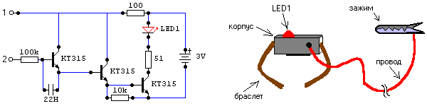 Был у меня в детстве такой пробник. Продвинутым парнем казался я знакомым. Он может пригодится для прозвонки деталей, дорожек, а также проводов в большом количестве или в труднодоступных местах. Пробник надевается на руку и при прикосновении рукой к выводам проверяемого проводника на нЈм загорается индикатор. Самый простой пример - у вас в руках несколько проводов связанных вместе и вам нужно определить где начало и где конец каждого из них. Нужно надеть браслет на руку, прикрепить зажим к одному из проводов и поочерЈдно дотрагиваться пальцем до других концов. При косании пальцем нужного провода, светодиод загорится. Область применения этого пробника давольно широка. Светодиод лучше взять импортный - с малым потребляемым током, хотя подойдет и отечественный АЛ307. Корпус я изготовил из алюминиевого экрана ВЧ блока от лампового телевизора. В нем есть пазы для платы, куда она въезжает. Для батареек сделал крепежи на плате. Браслет использовал металлический от часов. Так же, для увеличения видимости светодиода, наружу установил не сам светодиод, а рассеивающее увеличительное стекло красного севета от устройств индикации. Выключатель питания не нужен. Хороших батареек хватает на долго - более года. Безсмертный В.С. |