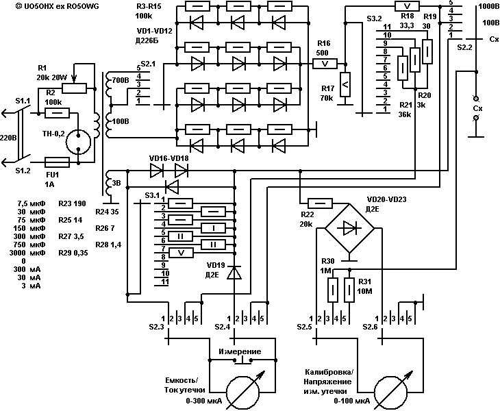 Этот прибор измеряет ток через электролитический конденсатор при подаче на него переменного напряжения 1,5В 50 Гц. Столь малая величина напряжения не пробивает оксидный слой, поэтому обратный ток не влияет на точность измерения. Шкала измерителя тока проградуированна в величинах емкости, с помощью эталонных конденсаторов. Так же прибор позволяет измерять ток утечки конденсаторов при его рабочем напряжении. Для измерения величины емкости необходимо, при подключенном конденсаторе, резистором R1 установить показания прибора 2 на середину шкалы (1,5В), и, нажав кнопку, выбрать предел шкалы измерителя переключателем S3. Этим же переключателем выбираем шкалу тока при измерении утечки. Режим измерения емкости и шкала напряжения при измерении тока выбирются переключателем S2. Напряжение, при измерении тока утечки, выставляется так же с помощью R1.