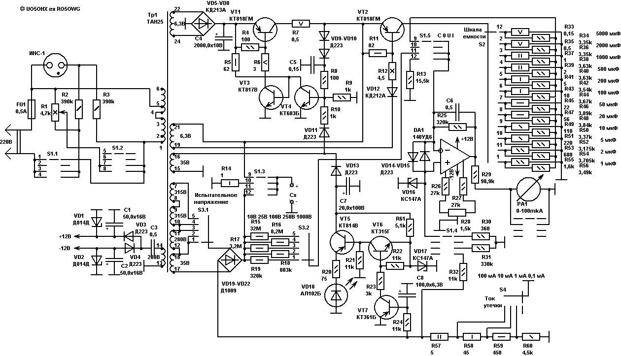 В этом измерителе используется линейная зависимость запасенной в конденсаторе энергии от величины его емкости. Ключ на транзисторе VT1 заряжает измеряемый конденсатор до стабильного напряжения 2 Вольта, а через ключ VT2 происходит измерение запасенной в нем энергии при разряде через шунты R33-R55. Процесс измерения происходит 50 раз в секунду. Измерение тока утечки производится при рабочем напряжении на конденсаторе, которое выставляется с помощью потенциометра мощностью 25 Ватт. Шкала емкостей 1, 2, 5, 10, 20, 50, 100, 200, 500, 1000, 2000, 5000 мкФ.Шкала напряжений 10, 25, 100, 250, 1000 Вольт. Шкала токов 0,1 , 1 , 10, 100 мА. Измерение тока производится тем же прибором после выставления рабочего напряжения. Для индикации перегрузки по току, при выставлении рабочего напряжения, служит светодиод VD18 загорающийся при 20% превышении текущей шкалы тока. В этом приборе измерительная головка защищена от перегрузки, но данный индикатор позволяет поберечь и шунты измерения тока и трансформатор. При измерении утечки напряжение питание схемы измерения тока так же меняется, поэтому оно стабилизировано с помощью VD1,VD2, что позволило применить в измерителе всего один трансформатор Тр1. Шустиков Е. Г. |