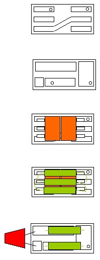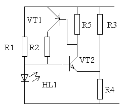 Технология такова. БерЈм кусочек двустороннего текстолита и выпиливаем прямоугольник 16х7 мм. Скальпелем прорезаем фольгу и формируем контактные площадки. С обратной стороны рисунок проще. Точками отмечены дырочки. Металлизировать отверстия лишняя морока, по этому просто пропускаем в дырочки проводки и соединяем верхние и нижние дорожки. Плата готова. Приступаем к монтажу деталей. Транзисторы кремниевые, прекрасно работает сладкая парочка КТ315 - КТ361, хотя в качестве VT1 чего только не втыкалось. Для минимизации размеров корпуса транзисторов можно подпилить надфилем, но главное не переусердствовать. Припаиваем транзисторы, прямой лицом, а обратный спиной вверх. Сверху напаиваем R1, R2, R5. Желательно ничего не перегреть и не перемкнуть. Теперь переворачиваем плату на спину и припаиваем делитель R3 R4 и светодиод. Припаиваем проволочную перемычку от плюса светодиода к базе VT2 и провода питания. Конструкция готова. Возможно, придЈтся поиграть сопротивлениям резисторов R3 и R4, но доступ к ним простой. Готовую конструкцию можно залить лаком, эпоксидкой, парафином…. Крепить еЈ лучше термоклеем, хотя можно увеличить размер платы и предусмотреть "уши", но это уже по месту. Теперь о деталях. Резисторы рассчитываем по эмпирическим формулам: