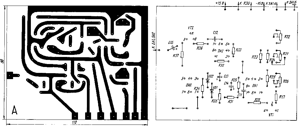 Операционные усилители К574УД1 и К140УД8 могут быть использованы с любыми буквенными индексами и возможна взаимная их замена без изменения рисунка печатной платы. Кроме того, вместо микросхемы К574УД1 можно применить К544УД2, а вместо К553УД2 микросхему К153УД2, но для каждого из этих случаев потребуется изменить рисунок токоведущих дорожек платы.