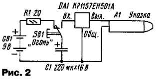В устройстве можно применить, кроме указанных на схеме, микросхему К176ЛА7, К564ЛА7, пьезоизлучатель ЗП-1; оксидные конденсаторы - К50, К52, К53, остальные - КМ-6, К10-17, любой подстроечный резистор, постоянные - МЛТ, С2-33, выключатель - любого типа, кнопка в пистолете - с самовозвратом. Налаживание пистолета сводится к подбору конденсатора С1 такой емкости, чтобы получить оптимальную длительность выстрела. В мишени резистором R1 устанавливают чувствительность, при которой она не реагирует на внешнее освещение. Саму мишень следует укрыть от прямых солнечных лучей и других источников света. Тональность и громкость звукового сигнала можно установить подбором конденсатора С3 (грубо) и резистора R3 (плавно). Продолжительность звукового сигнала устанавливают подбором конденсатора С2 и резистора R2. И. НЕЧАЕВ, г. Курск