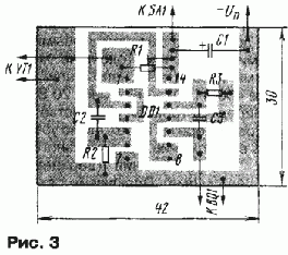 Схема пистолета приведена на рис. 2. В его состав входит лазерная указка А1, интегральный стабилизатор напряжения DA1, накопительный конденсатор С1, кнопка-курок SB1 и батарея питания GB1. В исходном состоянии конденсатор С1 заряжен от батареи питания. При нажатии на кнопку SB1 он подключится ко входу стабилизатора напряжения, в результате чего на лазерную указку поступит питающее напряжение 5 В. Она будет излучать свет в течение короткого отрезка времени (доли секунды), пока конденсатор не разрядится. Если свет попадет в мишень, прозвучит сигнал. После отпускания кнопки-курка конденсатор снова зарядится - пистолет готов к "выстрелу". Резистор R1 ограничивает зарядный ток конденсатора. Специального выключателя питания в пистолете нет, поскольку в режиме готовности ток от батареи практически не потребляется. Большинство деталей мишени размещают на печатной плате (рис. 3) из односторонне фольгированного стеклотекстолита.