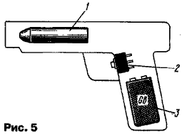 Конструкция пистолета показана на рис. 5. Для него понадобится корпус-"пустышка" подходящих размеров. Внутри него устанавливают лазерную указку 1 таким образом, чтобы она "стреляла" в полном соответствии с прицелом пистолета. Указку предварительно плотно обматывают изолентой, чтобы кнопка включения была нажата. В корпусе устанавливают также кнопку 2 и батарею питания 3. Монтаж ведут навесным методом.