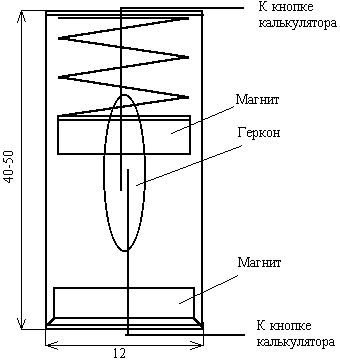 В центре крышек есть отверстия, через которые проходят электроды геркона. К нижней крышке неподвижно приклеен герметиком кольцевой магнит. Второй кольцевой магнит подвешен на пружине к верхней крышке. Пружина приклеена к магниту и крышке при помощи автомобильного силиконового герметика. Кольцевые магниты установлены противоположными полюсами так, чтобы они отталкивались друг от друга. К электродам геркона припаиваются гибкие провода, которые идут к калькулятору. В калькуляторе провода припаиваются к проводникам, которые замыкает кнопка «=».