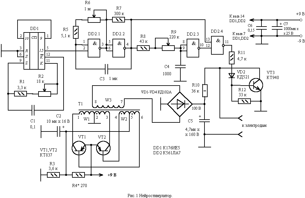 Функционально нейростимулятор состоит из двух генераторов импульсов, формирователя длительности импульсов, преобразователя напряжения и выходного усилителя. Генератор импульсов, реализованный на микросхеме DD1, на выходе выдает импульсы периодом от 1 секунды до 70 секунд (рис.1). Период импульсов устанавливается резистором R2. Импульсы первого генератора запускают второй генератор, реализованный на элементах DD2.1, DD2.2. Период этих импульсов устанавливается резистором R6. Таким образом, длительность импульсов первого генератора заполняется импульсами второго генератора. Пауза между пачками импульсов равна половине периода первого генератора. Для регулирования субъективного ощущения, выходные импульсы имеют одинаковую длительность, формируемую формирователем на элементах DD2.3, DD2.4. Длительность выходных импульсов от 50 до 250 мкс устанавливается резистором R9. На выводе 11 DD2.4 получаем импульсы отрицательной полярности. Поэтому выходной транзистор VT3 в паузах между пачками импульсов открыт, а во время прохождения импульсов – закрыт. Нагрузочный резистор R10 ограничивает выходной ток до 27-30 мА, обеспечивая безопасность человека.