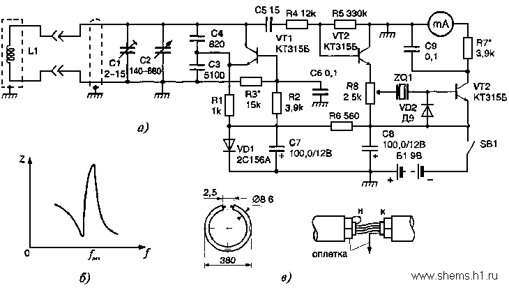 Вследствие высокой добротности кварцевого резонатора малейшие изменения частоты измерительного генератора будут приводить к уменьшению полного сопротивления последнего, как это видно из характеристики, приведенной на рис 1, б. Это, в конечном итоге, повысит чувствительность прибора и точность измерений. Подготовка к поиску заключается в настройке генератора на частоту параллельного резонанса кварца, равную 1 МГц. Эта настройка производится конденсаторами переменной емкости С2 (грубо) и подстроечным конденсатором С1 (точно) при отсутствии около рамки металлических предметов. Поскольку кварц является элементом связи между измерительной н индикаторной частями устройства, его сопротивление в момент резонанса велико и минимальное показание стрелочного прибора свидетельствует о точной настройке устройства. Уровень чувствительности регулируется переменным резистором R8. Особенностью устройства является кольцевая рамка L1, изготовленная из отрезка кабеля. Центральную жилу кабеля удаляют и вместо нее продергивают шесть витков провода типа ПЭЛ 0,1 -0,2 мм длиной 115 мм. Конструкция рамки показана на рис. 1, в. Такая рамка обладает хорошим электростатическим экраном. Жесткость конструкции рамки обеспечивается размещением ее между двумя дисками из оргетекла или гетйпакса диаметром 400 мм и толщиной 5—7 мм. В приборе использованы транзисторы КТ315Б, опорный диод — стабилитрон 2С156А, детекторный диод тина Д9 с любым буквенным индексом. Частота кварца может быть в интервале частот от 90 кГц до 1,1 МГц. Кабель — типа РК-50. Ссылки по теме Источник: shems.h1.ru |