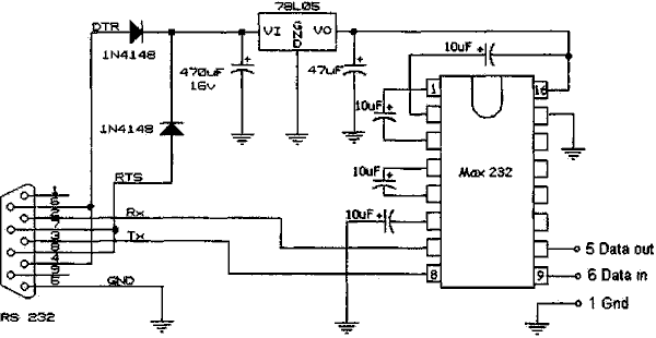 Предлагаем схему кабеля для соединения с компьютером телефонов Siemens C25, 525. Схема, показанная на рис.1, предназначена для согласования входных/выходных напряжений СОМ порта с интерфейсом мобильного телефона и применяется при передаче данных, раскодировке, сервисном обслуживании телефонов. В приведенной схеме используется питание от СОМ порта компьютера. При необходимости можно использовать внешний источник питания. Желающие могут собрать схему и на отечественной элементной базе, заменив микросхему МАХ232 инверторами микросхемы К561ЛН2 или двумя транзисторами. Также можно установить стабилизатор напряжения КРЕН5А, но следует помнить, что в этом случае схема может не работать от СОМ порта в связи с большим потреблением тока самим стабилизатором. Схема разъема телефона приведена на рис.2. Программы для работы с телефоном Siemens можно найти в Интернете.