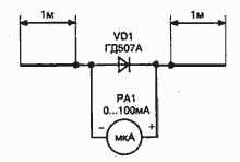 Окончательная подстройка выполняется при подключенной антенне по индикатору электромагнитного поля с помощью ферритового сердечника катушки L5 и конденсатора С11. Простейшая схема широкополосного индикатора поля показана на рисунке.
