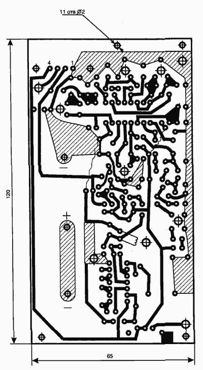 Топология односторонней печатной платы приемника и расположение элементов. Элементы R22, R23 и С31 расположены над микросхемой DD1. Для получения высокой плотности монтажа большинство резисторов устанавливаются вертикально на плате.