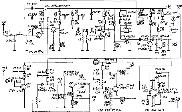 Принцип работы основан на индикации уровня напряжЈнности электрического поля закладок при удалении или приближении устройства обнаружения к ним. Уровень излучения радио закладок "оценивается по встроенному индикатору. Устройство обнаружения состоит из двух усилителей, один из которых совместно с фильтром обеспечивает контроль в первом поддиапазоне 65-155 МГц, а другой от 155 МГц до 410 МГц во втором поддиапазоне. Первый усилитель собран на транзисторе VT1 с входным фильтром C1,L1,C2 (рис.1), обеспечивающим фильтрацию зеркальных частот выше 155 МГц. Оба усилителя подключены к смесителю на транзисторе VT2 и могут работать только поочередно - каждый со своим гетеродином. Гетеродин, работающий с первым усилителем, собран на транзисторе VT8. Он перекрывает диапазон частот от 155 до 245 МГц. Второй гетеродин собран на транзисторе VT7. Он работает совместно с усилителем на транзисторе VT6 и перекрывает диапазон от 245 до 500 МГц. Смеситель на транзисторе VT2 нагружен на полосовой фильтр С12, L2, С13, L3 с промежуточной частотой (90±5) МГц. Таким образом, за счет первого гетеродина обеспечивается контроль в первом поддиапазоне частот от 65 до 155 МГц, а второго - во втором под-диапазоне от 155 до 410 МГц. Чувствительность устройства регулируется резистором R15. Аттенюатор на транзисторе VT4 обеспечивает регулировку уровня более чем на 25 дБ. Продетекти-рованный детектором VD1, VD2 сигнал подается на операционный усилитель DA1 и далее на индикатор уровня. Антенный вход приемника подключен через резистор R24, снижающий чувствительность, к коллектору VT5. Шкала переменного резистора R23 градуируется как для первого, так и для второго поддиапазонов по генератору высоких частот. Все детали устройства малогабаритные. Катушка L1- бескаркасная, с внутренним диаметром 6 мм, имеет 5 витков провода ПЭВ 0,7 мм. Катушки L2, L3 намотаны на полистироловых каркасах с подстроечными сердечниками из феррита 100НН диаметром 2,8 мм и длиной 14 мм, имеют по 10 витков провода ПЭЛШО 0,15 мм. Катушки L4, L5 - бескаркасные, с внутренним диаметром б мм и шагом намотки 1 мм, имеют: L4,- 4 витка и L5 - 6 витков провода ПЭВ 0,7 мм. Катушка L6 намотана поверх L5, имеет 2 витка провода ПЭВ 0,5 мм. Устройство настраивают с использованием прибора для измерения АЧХ, например Х1-42. Первоначально настраивают полосовой фильтр С12, L2, С13, L3 на центральную частоту 90 МГц с полосой ориентировочно равной 5 МГц. Если в вашей местности есть радиостанции, имеющие существенный уровень сигнала в данном диапазоне, то лучше выбрать другую центральную частоту в диапазоне 88 - 108 МГц или сузить полосу фильтра. Далее настраиваются первый и второй гетеродины. Изменяя параметры катушек и режимы работы транзисторов по постоянному току, добиваются, чтобы АЧХ фильтра плавно перемещалась в первом диапазоне от 65 МГц до 155 МГц, а во втором диапазоне от 155 МГц до 410 МГц. Последним настраивают фильтр С1, L1, С2 так, чтобы уровень сигналов зеркального канала был на 15 - 20 дБ меньше основного канала. Работа с прибором сводится к следующему. Первоначально резистором R15 устанавливается максимальный порог чувствительности "антишпиона". Далее, плавно вращая ручку резистора R23, контролируют по индикатору РА1 уровень сигналов сначала в первом, а затем во втором поддиапазоне. Если работает радиостанция или "жучок", то стрелка индикатора отклонится. Далее, меняя положение прибора в помещении, сле